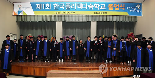 | △ 국내 유일 다문화 교육기관 '다솜학교' 첫 졸업식 (제천=연합뉴스) 전창해 기자 = 국내 유일의 기숙형 다문화 교육기관인 충북 제천의 한국폴리텍 다솜학교는 6일 첫 졸업식을 했다. 2015.2.6 jeonch@yna.co.kr |