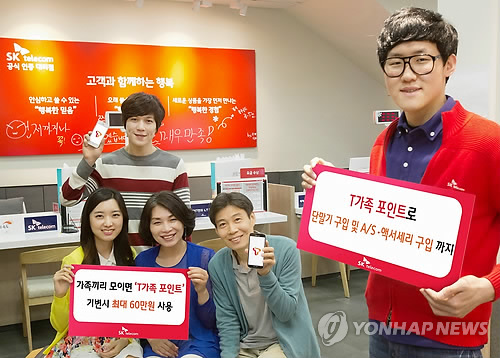 | △ SKT, 가족결합시 포인트 주고 약정할인 반환금 없앤다 (서울=연합뉴스) SK텔레콤은 오는 18일 가족형 결합상품에 가입한 고객에게 기기변경이나 단말기 애프터서비스(AS) 등에 사용할 수 있는 포인트를 매월 제공하는 'T가족 포인트'를 출시한다고 12일 밝혔다. 이 프로그램에 가입하면 2~5인 가족에게 매월 일인당 1천500~5천 포인트씩 총 3천~2만 5천 포인트를 제공하며 포인트는 기기변경이나 단말기 AS 외에 T월드 다이렉트에서 액세서리나 T프리미엄 내 유료 콘텐츠 구매 시에도 사용할 수 있다. 2014.11.13 << SKT 제공 >> photo@yna.co.kr |