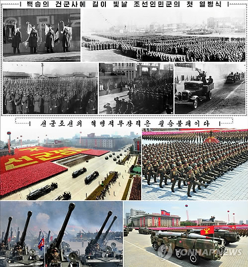 △ 북한, 군열병식 '과거와 현재' 비교하며 무력 과시 (서울=연합뉴스) 북한 노동당 기관지 노동신문은 8일 정규군 창설 67주년을 맞아 1948년 군열병식 사진과 최근 열병식 사진을 연이어 싣고 무력을 과시했다. 북한이 37년 만에 2월8일을 '정규군 창설일'로 조명하며 연일 대대적 홍보에 나서는 것은 대북 압박수위를 높이는 미국과 한미연합군사훈련 등에 무력을 과시하려는 의도로 풀이된다. 2015.2.8 nkphoto@yna.co.kr