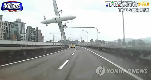 | △ 지난 4일 대만 쑹산공항에서 이륙한 지 수 분 만에 추락하고 있는 대만 푸싱(復興)항공 국내선 여객기. 대만 TVBS방송 영상 캡처. (AP=연합뉴스) |