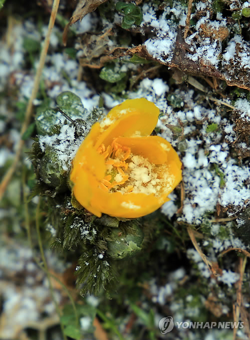 | △ (제주=연합뉴스) 고성식 기자 = 8일 제주 산간에 대설특보가 내려진 가운데 제주절물자연휴양림 목교(木橋) 밑 계곡에 노란 꽃을 피운 '봄의 전령' 복수초에도 봄을 시샘하는 눈이 내렸다. 2015.2.8. koss@yna.co.kr |