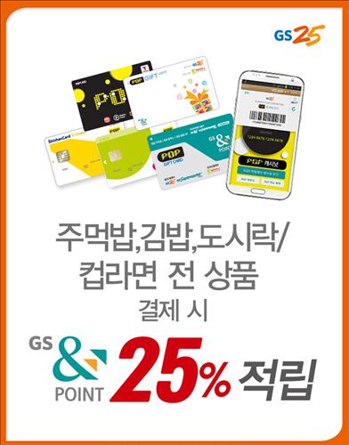 (서울=연합뉴스) 최이락 기자 = GS리테일이 운영하는 편의점 GS25는 이달 26일까지 도시락, 주먹밥, 김밥, 컵라면 상품을 팝카드로 결제시 GS&POINT 25%를 적립해 준다고 9일 밝혔다.