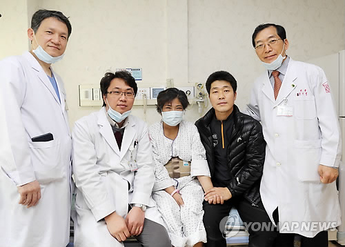 | △ 아내에게 간 기증한 남편 (대구=연합뉴스) 지난달 13일 대구 계명대학교 동산의료원에서 남편 김완수(45·오른쪽 두 번째)씨가 간경변증을 앓는 아내 이윤연(47·가운데)씨를 위해 자신의 간 반 이상을 내줬다. 사진은 지난 2일 김씨부부가 의료진과 기념촬영 모습. 2015.2.9 <<동산의료원 제공>> sunhyung@yna.co.kr |