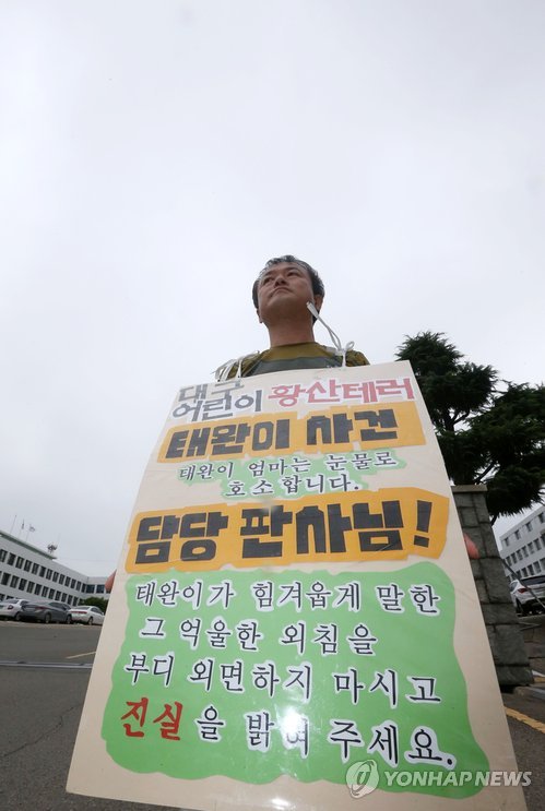 △ 대구법원 앞에서 피켓을 걸고 1인 시위 하는 태완군 아버지. <<연합뉴스DB>>