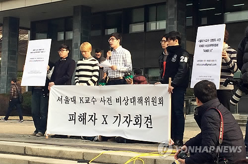 | △ "학생 성추행 의혹 K교수 사태 명백히 밝혀야" (서울=연합뉴스) 서울대 학생들이 27일 관악캠퍼스 대학본부에서 기자회견을 열고 자신이 가르치는 학생 등을 상습적으로 성추행한 의혹을 받는 서울대 수리과학부 K교수에 대한 학교 측의 철저한 진상조사를 요구하고 있다. K교수는 전날 사표를 제출했고 학교 측은 면직 처리를 하기로 했다. 2014.11.27 << 서울대 단과대학생회장연석회의 제공 >> photo@yna.co.kr |