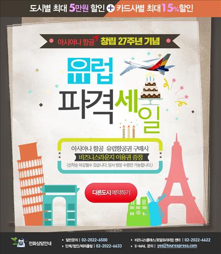 (서울=연합뉴스) 전준상 기자 = SM C&C 투어익스프레스는 아시아나항공 창립 27주년을 기념하기 위해 17일까지 '아시아나항공 유럽 파격 세일 기획전'을 진행한다고 10일 밝혔다.