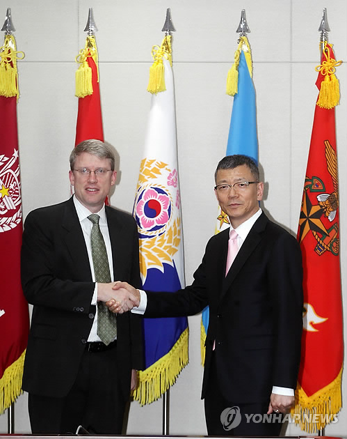| △ 한·미 통합국방협의체 회의 (서울 사진공동취재단=연합뉴스) 17일 서울 용산구 국방부에서 열린 제6차 한·미 통합국방협의체(KIDD)회의에서 한국측 대표 류제승 국방정책실장(오른쪽)과 미국측 대표 데이비드 헬비 동아시아부차관보가 악수하고 있다. 2014.9.17 photo@yna.co.kr |
