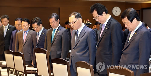 △ 정홍원 국무총리가 지난해 2월 27일 오전 정부세종청사 대회의실에서 열린 안전관련 관계부처 장관 및 시도지사 간담회에서 참석자들과 함께 경주 마우나 리조트 붕괴사고 희생자들에 대한 묵념을 하고 있다. (연합뉴스 자료사진)