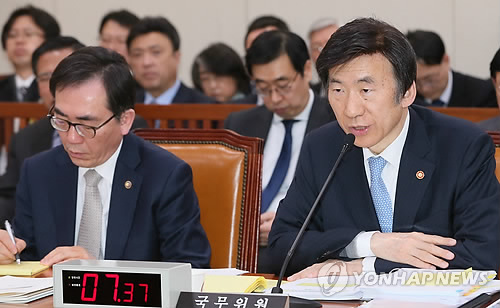 △ 답변하는 윤병세 외교장관 (서울=연합뉴스) 진성철 기자 = 윤병세 외교부 장관이 10일 국회 외교통일위원회에서 질의에 답변하고 있다. 왼쪽은 조태열 2차관.