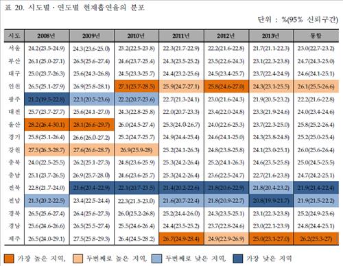 11일 건양대 홍지영 교수팀이 질병관리본부의 정책연구용역사업을 수행하고 제출한 '지역사회건강조사 건강행태 지표 관련 영양요인 분석연구' 보고서에 따르면 전국에서 지난 2008∼2013년 평균 현재흡연율이 가장 높은 지역은 제주도였다.