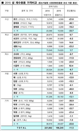 이에 따라 이 기간 홈플러스에서 23개 제수용품을 마련해 차례상을 차릴 경우, 4인 가족 기준 비용(19만6천245원)이 작년 설 중소기업청·소상공인시장진흥공단 조사 당시 전국 대형마트 평균 차례상 비용(22만1천662원)보다 2만5천417원 싸다는 게 홈플러스측의 설명이다.