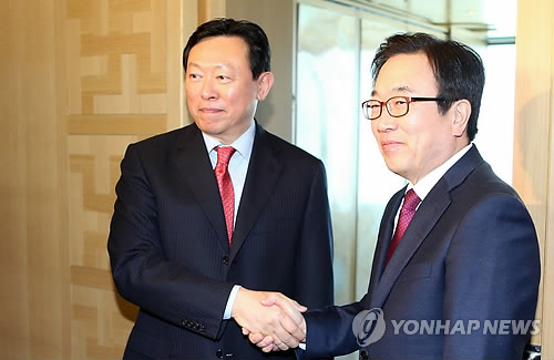△ 손잡은 신동빈 롯데회장-서병수 부산시장 (부산=연합뉴스) 조정호 기자 = 신동빈 롯데그룹 회장(왼쪽)이 이달 출범이 예정된 부산 창조경제혁신센터 준비상황을 점검하기 앞서 11일 부산시 부산진구 롯데호텔에서 서병수 부산시장을 만나고 있다. 2015.2.11 ccho@yna.co.kr