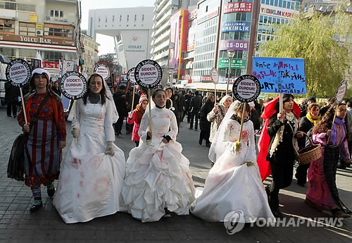 | △ 웨딩드레스를 입은 터키 여성 인권운동가들이 2011년 11월 '폭력종식'이라고 쓰인 플래카드를 들고 성폭행, 가정폭력 등에 반대하는 시위를 벌이고 있다. (AP=연합뉴스 자료사진) |