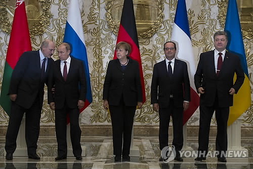 | △ 민스크 4자 정상 회동 (AP=연합뉴스) 우크라이나 사태 해결 방안을 논의하기 위해 11일(현지시간) 벨라루스 수도 민스크 시내 독립궁전에서 회동을 시작한 러시아·우크라이나·프랑스·독일 4개국 정상 등이 잠시 포즈를 취하고 있다. 왼쪽부터 알렉산드르 루카셴코 벨라루스 대통령, 블라디미르 푸틴 러시아 대통령, 앙겔라 메르켈 독일 총리, 프랑수아 올랑드 프랑스 대통령 및 페트로 포로셴코 우크라이나 대통령. |