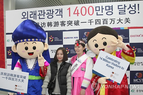 △ 1천400만번째 외래관광객 맞은 청주공항 (청주=연합뉴스) 김형우 기자 = 29일 오후 청주공항이 1천400만번째 외래관광객을 맞은 가운데 한 중국인 관광객이 기념촬영을 하고 있다. 2014.12.29 vodcast@yna.co.kr