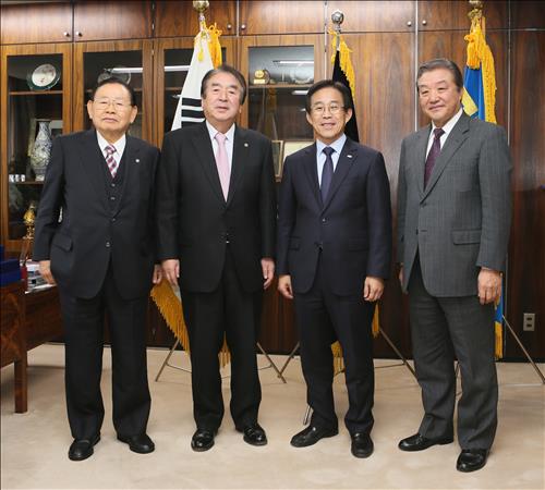 △ 지난 1월 29일 재일본대한민국민단을 방문한 이창섭 국민체육진흥공단이사장이 오공태 단장 등과 간담회를 갖고 재일 차세대의 모국유학 장학금 지원사업을 2019년까지 5년 연장할 뜻을 전했다. 왼쪽부터 김한익 민단 의장, 오공태 단장, 이창섭 이사장, 한재은 감찰위원장