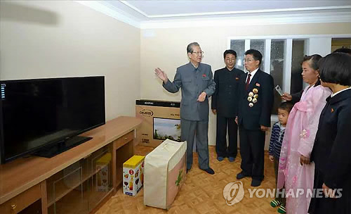 | △ (서울=연합뉴스) 작년 10월 평양 위성과학자주택지구에 입주한 과학자 가족들과 대화하는 최태복 최고인민회의 의장(사진 가운데 잿빛 옷을 입은 사람). 노동신문 사진. <<자료사진>> |
