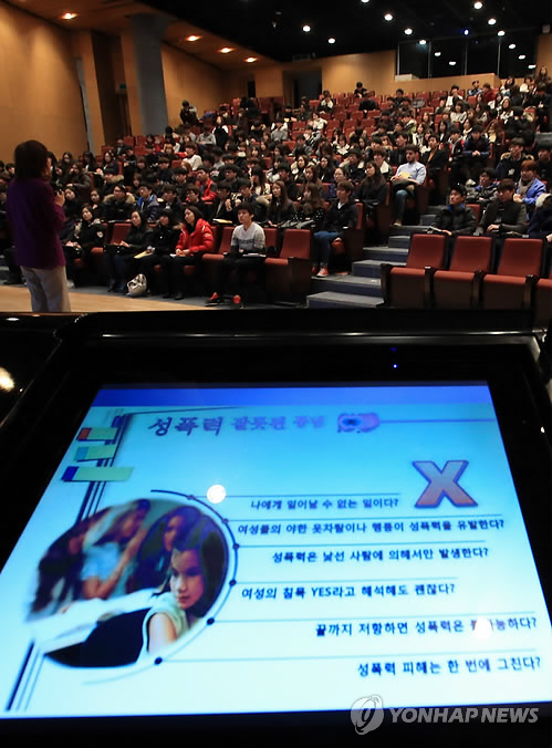 | △ 대학 새내기 대상 성폭력 예방교육 (서울=연합뉴스) 홍해인 기자 = 12일 서울 종로구 명륜3가 성균관대학교 경영관에서 이 대학 경영학과 신입생들이 이복실 전 여성가족부 차관으로부터 성폭력 예방교육 특강을 받고 있다. 2015.2.12 hihong@yna.co.kr |