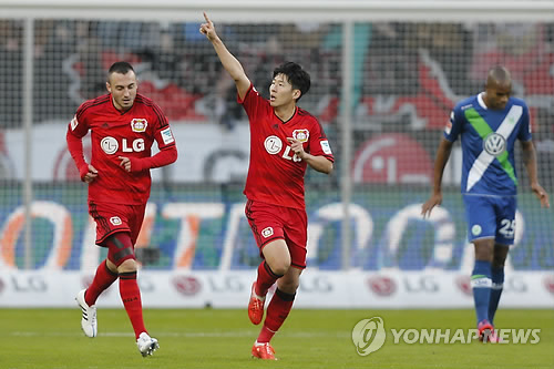 | △ 손흥민, 해트트릭 (AP=연합뉴스) 14일(현지시간) 독일 레버쿠젠에서 볼프스부르크와의 2014-2015 독일 프로축구 분데스리가 홈 경기에서 손흥민(가운데)이 손가락으로 공중을 가리키며 자신의 골 성공을 기뻐하고 있다. 손흥민은 이날 경기 후반 12분과 17분, 22분 연달아 골을 폭발하며 해트트릭을 작성했다. bulls@yna.co.kr |