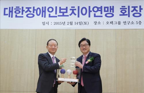14일 서울 양평동 오텍그룹 R&D센터에서 열린 취임식에는 우원식 국회의원(전 보치아연맹 회장), 김성일 대한장애인체육회장 등이 참석했다.