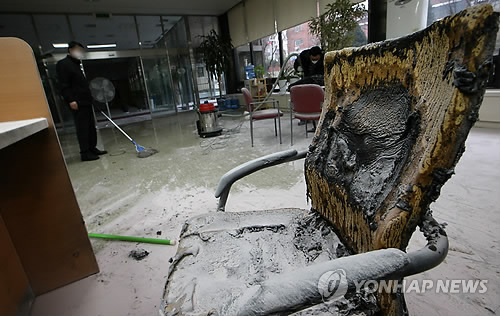 | △ (서울=연합뉴스) 양지웅 기자 = 16일 오전 서울 성동구 마장동 한국전력 성동지사 1층 민원봉사실에서 이모(58)씨가 분신을 시도하는 사고가 발생했다. 직원들이 화재 현장을 청소하고 있다. |