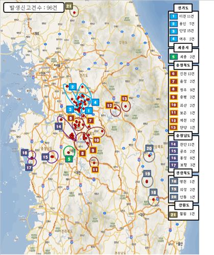 농식품부는 "충북·경북은 안정화 추세이고, 홍성·보령·천안 등 충남과 안성·용인·이천 등 경기지역을 중심으로 산발적으로 발생하고 있다"면서 "기존 발생지역을 중심으로 추가발생가능성이 있다"고 말했다.