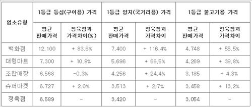 한우 1등급 등심(구이용)의 100g당 평균 판매가격은 백화점(1만2천100원), 대형마트(7천300원), 슈퍼마켓(6천727원), 정육점(6천589원), 조합매장(6천568원) 순이었다. 정육점과 비교하면 백화점은 84%, 대형마트는 11% 비쌌다.