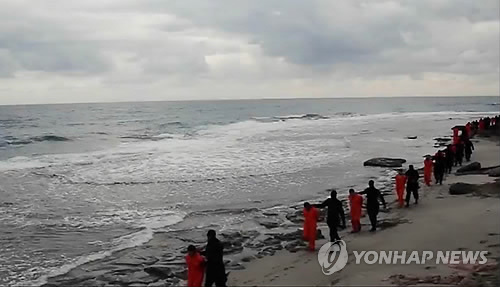 | △ (AP=연합뉴스) 이슬람 극단주의 무장세력 '이슬람국가'(IS)가 리비아에서 인질로 잡았던 이집트인 콥트교도 21명을 참수했다고 15일(현지시간) 인터넷에 올린 동영상을 통해 주장했다. 이 영상에서는 IS 대원들이 복면을 한 채 주황색 죄수복을 입은 이집트인 콥트교도 인질들을 한 해변으로 데려가 무릎꿇리고, 이후 바닷물이 피로 물드는 장면과 함께 이들이 참수됐다는 내용이 나온다. 사진은 이날 공개된 영상 중 IS 대원들이 복면을 한 채 콥트교도 인질들을 끌고 가는 모습. |