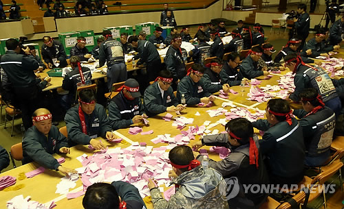 △ 현대중 노조, 임단협 2차 합의안 찬반투표 개표 (울산=연합뉴스) 김용태 기자 = 현대중공업 노조가 16일 오후 울산 현대중공업 본사에서 2014년 임단협 2차 합의안 찬반투표 개표를 하고 있다. 2015.2.16 yongtae@yna.co.kr