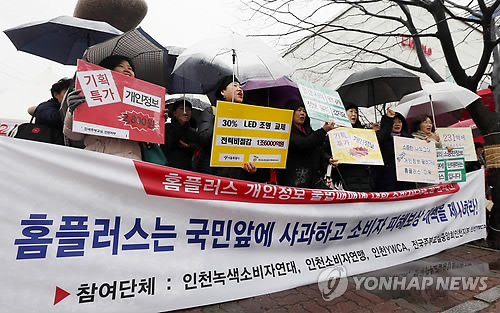 | △ 인천 소비자단체 "불법 개인정보 유출 배상하라" (인천=연합뉴스) 윤태현 기자 = 16일 오후 인천시 남동구 간석동 홈플러스 앞에서 인천녹색소비자연대 등 시민단체 회원들이 고객 개인정보를 보험사에 넘긴 홈플러스를 규탄하는 기자회견을 하고 있다. |