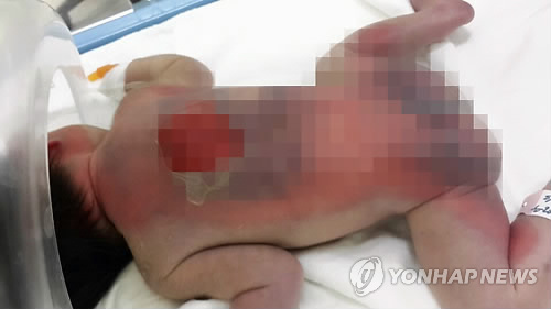 △ 병원 인큐베이터에서 중화상 입은 신생아 (안동=연합뉴스) 이덕기 기자 = 경북 안동의 한 산부인과 병원에서 신생아 두 명을 전기 매트 위에 올려놓고 제대로 돌보지 않아 아이들이 중화상을 입는 사고가 일어났다. 사진은 4도의 중화상을 입은 이모(29)씨의 딸. 2014.9.12 duck@yna.co.kr