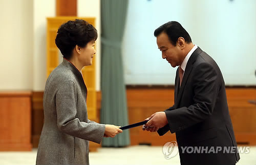 | △ 임명장 받는 이완구 총리 (서울=연합뉴스) 도광환 기자 = 이완구 신임 국무총리가 17일 오전 청와대에서 박근혜 대통령으로부터 임명장을 받고 있다. 새누리당은 원내대책회의에서 이완구 신임 국무총리에게 여권이 힘을 실어줘 명실상부한 '책임총리'를 구현해야 한다고 강조했다. |