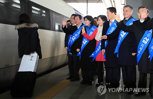| △ 새정치연합 지도부 설 귀성객 인사 (서울=연합뉴스) 홍해인 기자 = 문재인 대표(오른쪽 둘째)를 비롯한 새정치민주연합 지도부가 설 명절 연휴를 하루 앞둔 17일 오전 서울 한강로3가 용산역 승강장에서 귀성 열차에 탄 시민들에게 인사하고 있다. |