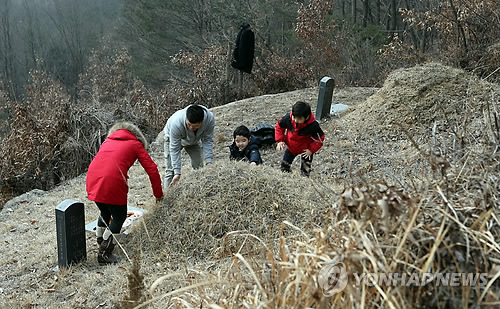 | △ 설 연휴를 앞둔 15일 대전 서구 괴곡동 시립묘지를 찾은 한 가족이 성묘를 하고 있다. |