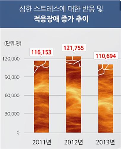 20일 건강보험심사평가원에 따르면 '심한 스트레스에 대한 반응 및 적응장애'로 진료를 받은 환자의 수는 2011년 11만5천명, 2012년 12만1천명, 2013년 11만명 등으로 3년간 연평균 11만5천명이었다.