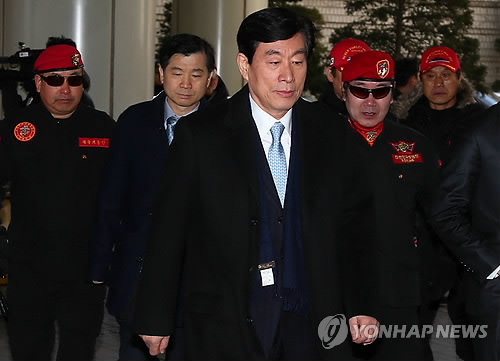 △ epa04611395 Won Sei-hoon (C), former head of the South Korean National Intelligence Service, arrives in an appellate court.to be sentenced at the high court in Seoul, South Korea, 09 February 2015. The court sentenced him to three years in jail for intervening in the 2012 presidential election. EPA/KIM CHUL-SOO