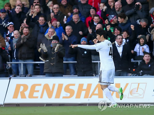 | △ 스완지시티의 기성용이 21일(현지시간) 영국 웨일스의 리버티 스타디움에서 열린 2014-2015 잉글랜드 프로축구 프리미어리그 26라운드 맨체스터 유나이티드(이하 맨유)와의 홈 경기에서 전반 30분 득점에 성공한 뒤 기뻐하고 있다.(AP=연합뉴스) |