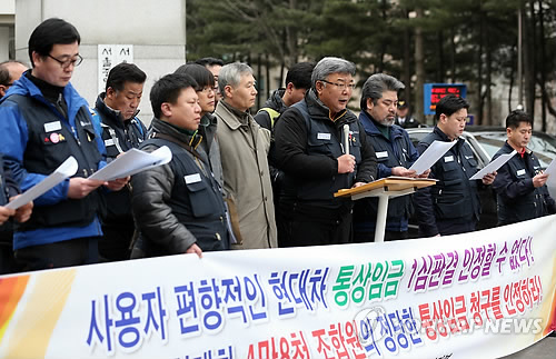 | △ 현대차 노조, 통상임금 소송 항소장 제출 (서울=연합뉴스) 신준희 기자 = 29일 오전 서초동 서울고등법원 앞에서 금속노조 현대자동차지부 조합원들이 '사용자 편향적인 통상임금 1심판결은 인정할 수 없다'며 항소장 제출 기자회견을 하고 있다. 2015.1.29 hama@yna.co.kr |