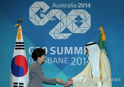 △ 작년 11월 호주 브리즈번에서 열린 G20 정상회의 때 박근혜 대통령이 살만 압둘 아지즈 사우디 왕세제를 만나 악수하고 있다. 살만 왕세제는 올 1월 왕위에 올랐다.