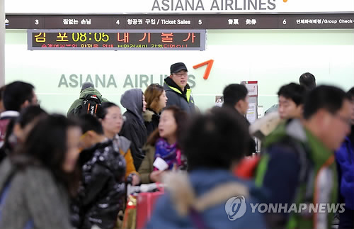 △ '대기불가' 귀경길 (제주=연합뉴스) 김호천 기자 = 설 연휴 마지막 날인 22일 제주공항 출발 항공편 예약률이 100%를 기록, 수백명이 표를 구하지 못해 발을 굴렀다. 아시아나항공 발권 카운터의 '대기불가'란 문구가 탑승권이 바닥났음을 알리고 있다. 2015.2.22 khc@yna.co.kr