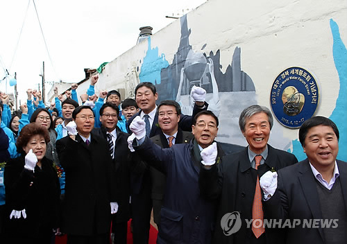 | △ '2015 제7차 세계물포럼' 개최 (서울=연합뉴스) 2015 세계물포럼조직위는 내년 세계물포럼 개최를 앞두고 경주 첨성대 인근 인왕동 일대를 물과 관련한 다양한 주제의 벽화로 장식한 기념거리로 지정하고 4일 기념식을 했다. 이정무 2015 세계물포럼 조직위원장(앞줄 오른쪽 세 번째)을 비롯한 내빈들과 세계물포럼 서포터즈가 파이팅을 외치고 있다. 2014.12.4 << 2015 세계물포럼 조직위원회 제공 >> photo@yna.co.kr |