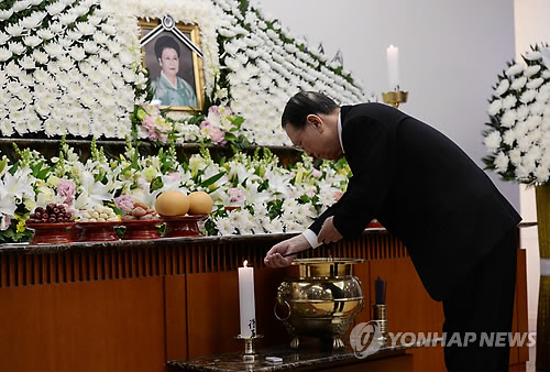 | △ 조문하는 김기춘 실장 (서울=연합뉴스) 김수진 기자 = 김기춘 청와대 비서실장이 22일 서울 아산병원 장례식장에 마련된 김종필 전 총리의 부인 박영옥씨 빈소를 찾아 분향하고 있다. ksujin@yna.co.kr |