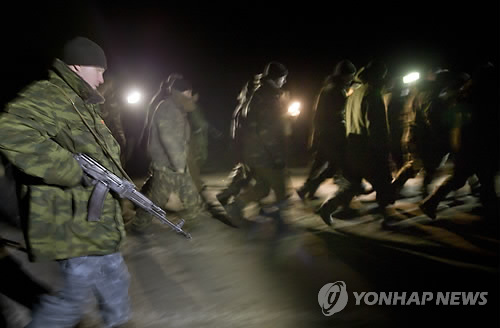 | △ 교환장소로 호송되는 우크라 정부군 포로들 (AP=연합뉴스) 우크라이나 동부도시 루간스크 인근 졸로보크에서 21일(현지시간) 정부군과 반군 간의 포로 교환이 처음으로 이루어졌다. 양측은 각각 포로로 잡고 있던 반군 52명과 정부군 139명을 상대방에게 남겼다. 사진은 무장한 친(親)러시아 반군이 정부군 포로들을 이날 포로교환 장소로 호송하고 있는 모습. |