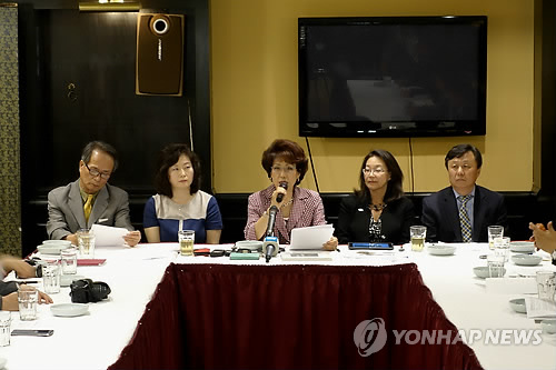 | △ (워싱턴=연합뉴스) 김세진 특파원 = 미국 버지니아주 페어팩스카운티에 일본군위안부 기림비를 세운 '일본군 위안부 기림비 평화가든 건립위원회' 위원들은 작년 5월27일(현지시간) 워싱턴DC 근교에서 기자회견을 열고 "후세 교육을 위해" 이번 일을 했다고 설명했다. 왼쪽부터 이문형 워싱턴지역 정신대문제 대책위원회(정대위) 공동이사장, 이정실 정대위 부회장(현 정대위 회장), 김광자 정대위 회장, 그레이스 울프 버지니아주 헌든시(市) 시의원, 황원균 건립위원회 위원장. 출처 = 워싱턴 김세진 특파원 2014.5.28 |