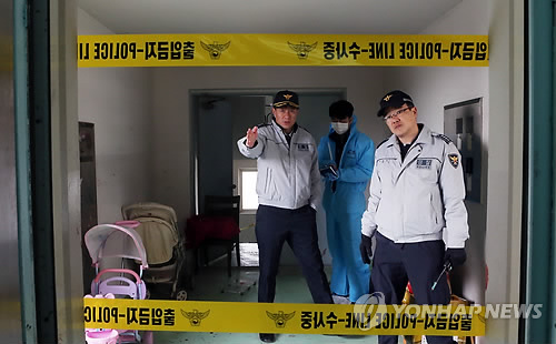 △ 살인 사건이 발생한 천안 아파트 (천안=연합뉴스) 양영석 기자 = 23일 오전 7시께 충남 천안시 서북구 직산읍 한 아파트에서 일가족이 흉기에 찔린 채 발견됐다. 경찰이 사건이 발생한 아파트 현장 출입을 통제하고 있다. 2015.2.23 youngs@yna.co.kr