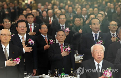 △ 광복회, 창립 50주년 기념식 (서울=연합뉴스) 최재구 기자 = 정의화 국회의장, 박유철 광복회장, 박승춘 국가보훈처장 등이 23일 서울 여의도 63컨벤션에서 열린 광복회 창립 50주년 기념식에서 국기에 경례하고 있다. 2015.2.23 jjaeck9@yna.co.kr