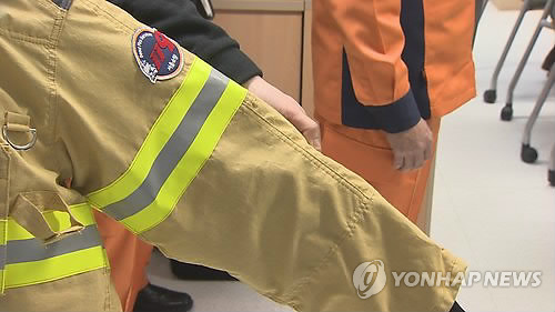 | △ '착용보류' 방화복 1만 9천벌 전량 소방현장서 퇴출 (서울=연합뉴스) 국민안전처는 품질 검증이 되지 않아 착용이 보류된 특수방화복 1만 9천 벌 전량을 소방현장에서 퇴출하기로 했다고 23일 밝혔다. 지난 16일 국민안전처 관계자가 문제가 된 소방특수방화복을 설명하고 있다. (연합뉴스TV) |