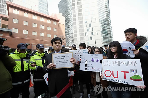 | △ '다케시마 OUT!' (서울=연합뉴스) 박동주 기자 = 23일 오전 서울 종로구 일본대사관 앞에서 사단법인 영토지킴이 독도사랑회 관계자들이 일본 시마네현의 '다케시마의 날' 기념행사 철폐 등을 촉구하며 대사관 측에 성명서를 제출하기 위해 이동하고 있다. 2015.2.23 pdj6635@yna.co.kr |