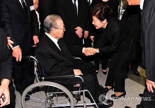 | △ JP 위로하는 박근혜 대통령 (서울=연합뉴스) 양지웅 기자 = 박근혜 대통령이 23일 오후 송파구 서울아산병원 장례식장에 마련된 김종필 전 국무총리의 부인 故 박영옥 씨의 빈소를 찾아 조문 후 김 전 총리를 위로하고 있다. |