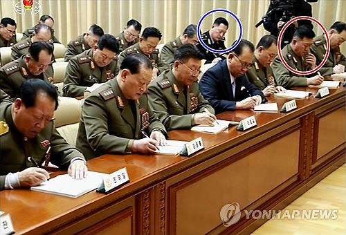 △ 북한 노동당 중앙군사위 회의 등장한 장정남·김명식 (서울=연합뉴스) 조선중앙TV는 23일 노동당 중앙군사위원회 확대회의 소식을 전하며 장정남(빨간색 동그라미) 전 인민무력부장이 회의장 맨 앞줄에 앉아있는 사진을 방송했다. 장정남은 2013년 5월 50대 초반의 나이에 김격식의 뒤를 이어 인민무력부장에 오르는 등 승승장구했지만 1년여 만에 자리에서 물러났고 작년 9월 이후 공개석상에서 자취를 감췄다. 그가 황병서 총정치국장, 리영길 총참모장과 같은 군부 핵심 인물들과 같은 줄에 앉은 점으로 미뤄 높은 위상을 갖고 있는 것 아니냐는 분석도 나온다. 일각에서 경질설이 제기됐던 김명식 해군사령관(파란색 동그라미)도 둘째 줄에 모습을 드러내 건재함이 확인됐다. 2015.2.23 nkphoto@yna.co.kr